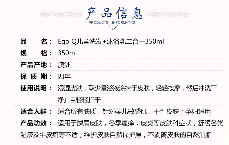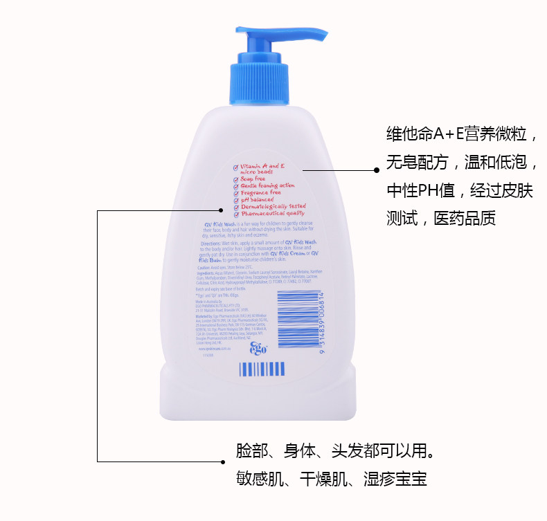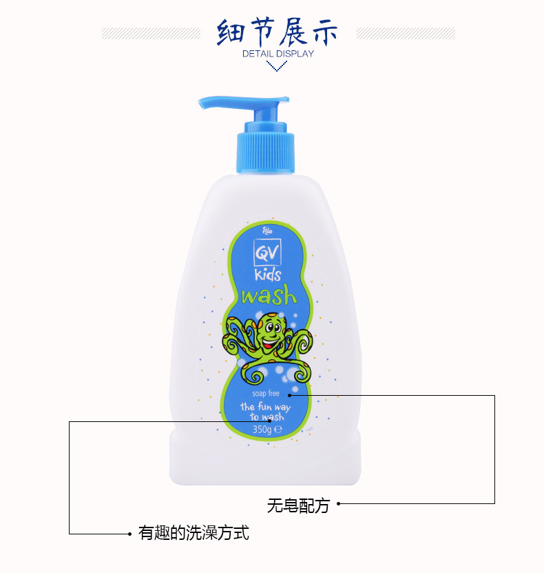 无皂配方更安全。浴液中富含维E和维A的营养微粒,在使用的同时会瞬间神奇的消失,使孩子洗澡更有乐趣!这是一款专门为儿童干性,敏感性的皮肤设计的浴液产品,无皂低沫配方更含有甘油成分以保持幼嫩肌肤水润。温馨提示:产品购于澳洲,澳洲直邮,没有中文标签。