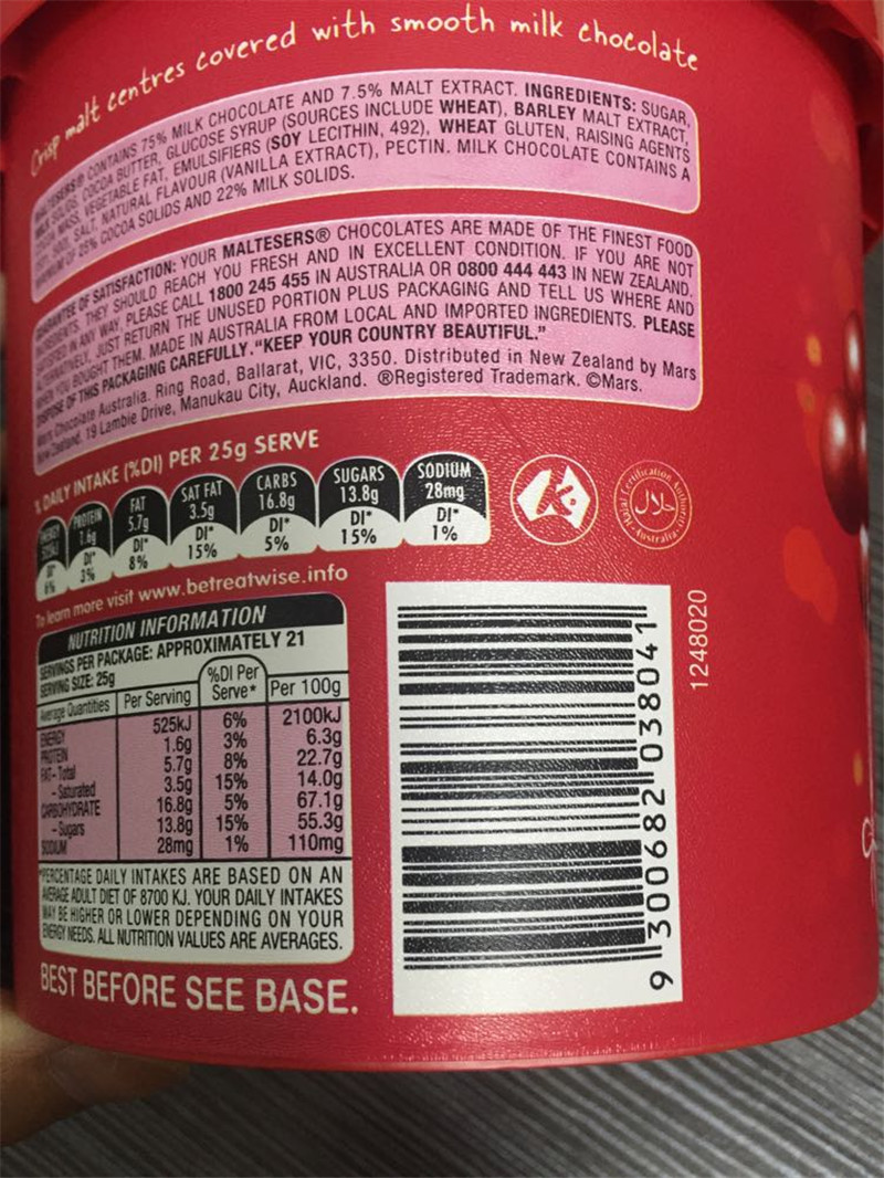 偏远地区按照实际运费支付。圣诞元旦情人节还是要选520(我爱你)!maltesers麦提莎巧克力外层香滑巧克力,内馅香脆,让你忍不住想咬一口!现在的新款麦提莎,已经过多重改良,无论是口感还是包装,都让人爱不释手,每一口都有香浓巧克力味,松脆的威化令你回味无穷。是超市里的热销零食哦!