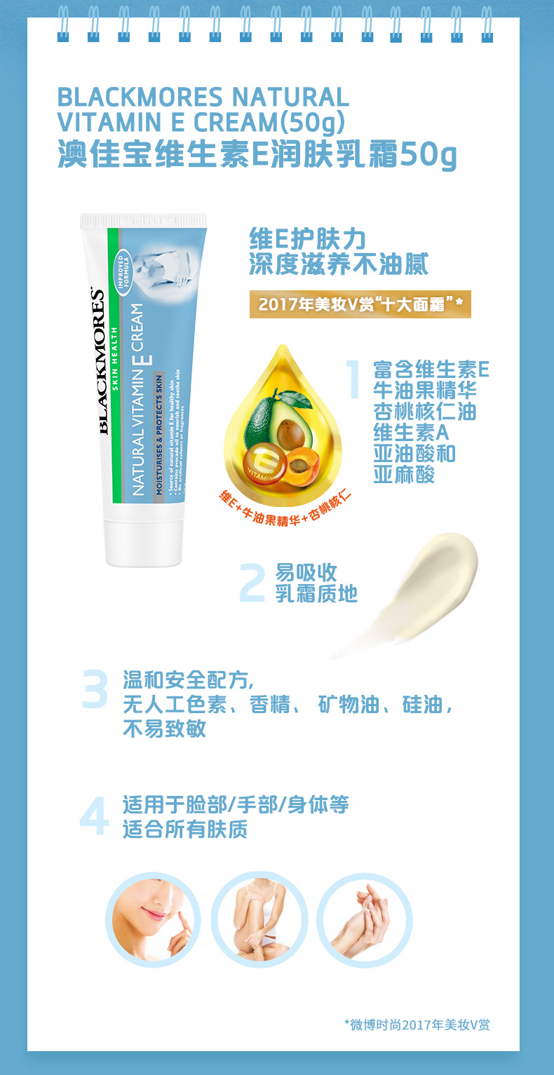 温馨提示:产品购于澳洲,无中文标签,仅限个人自用,不得二次出售!温馨提示:产品购于澳洲,澳洲直邮,没有中文标签。购买数量不要超过限购数量哦~否则仓库不打包哦~ 滋养和舒缓皮肤; •防止水份流失; •含有天然来源的维生素E,使肌肤保持健康状态; • 含有鳄梨油滋养,舒缓肌肤; •不含香料。温馨提示:产品购于澳洲,无中文标签,仅限个人自用,不得二次出售!