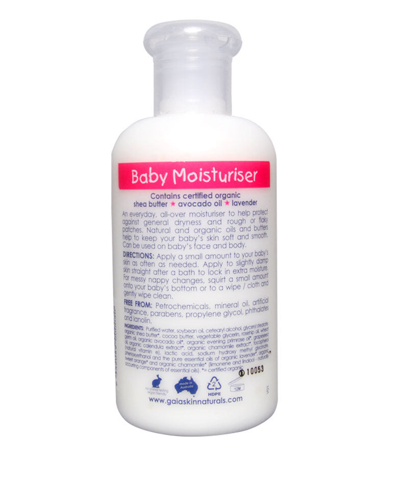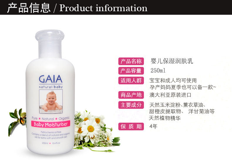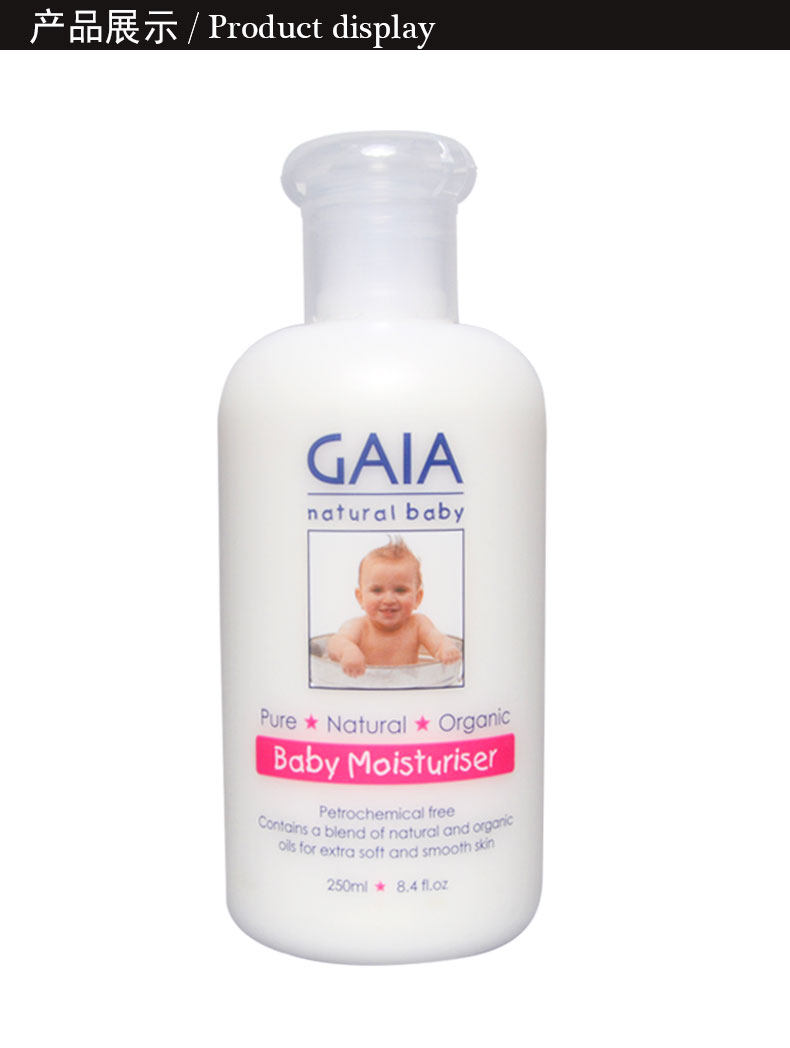 温馨提示:产品购于澳洲,无中文标签,仅限个人自用,不得二次出售!温馨提示:产品购于澳洲,澳洲直邮,没有中文标签。采用全天然有机配方的GAIA婴儿润肤乳,是由纯正、天然的植物油制成,能滋润干燥、粗糙及敏感肌肤,令皮肤回复柔软顺滑,绝不含化学及矿物油。性质温和,专为宝宝设计,适合敏感皮肤的宝宝,非常安全,也适合大人,于怀孕期间使用,能维持肚皮皮肤弹性,预防干燥。温馨提示:产品购于澳洲,无中文标签,仅限个人自用,不得二次出售!