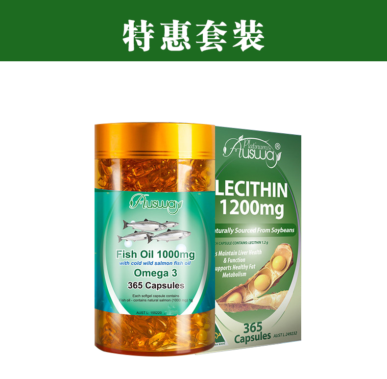【融化不赔】【澳洲直邮】特惠套装AUSWAY深海三文鱼油+卵磷脂组合装365粒