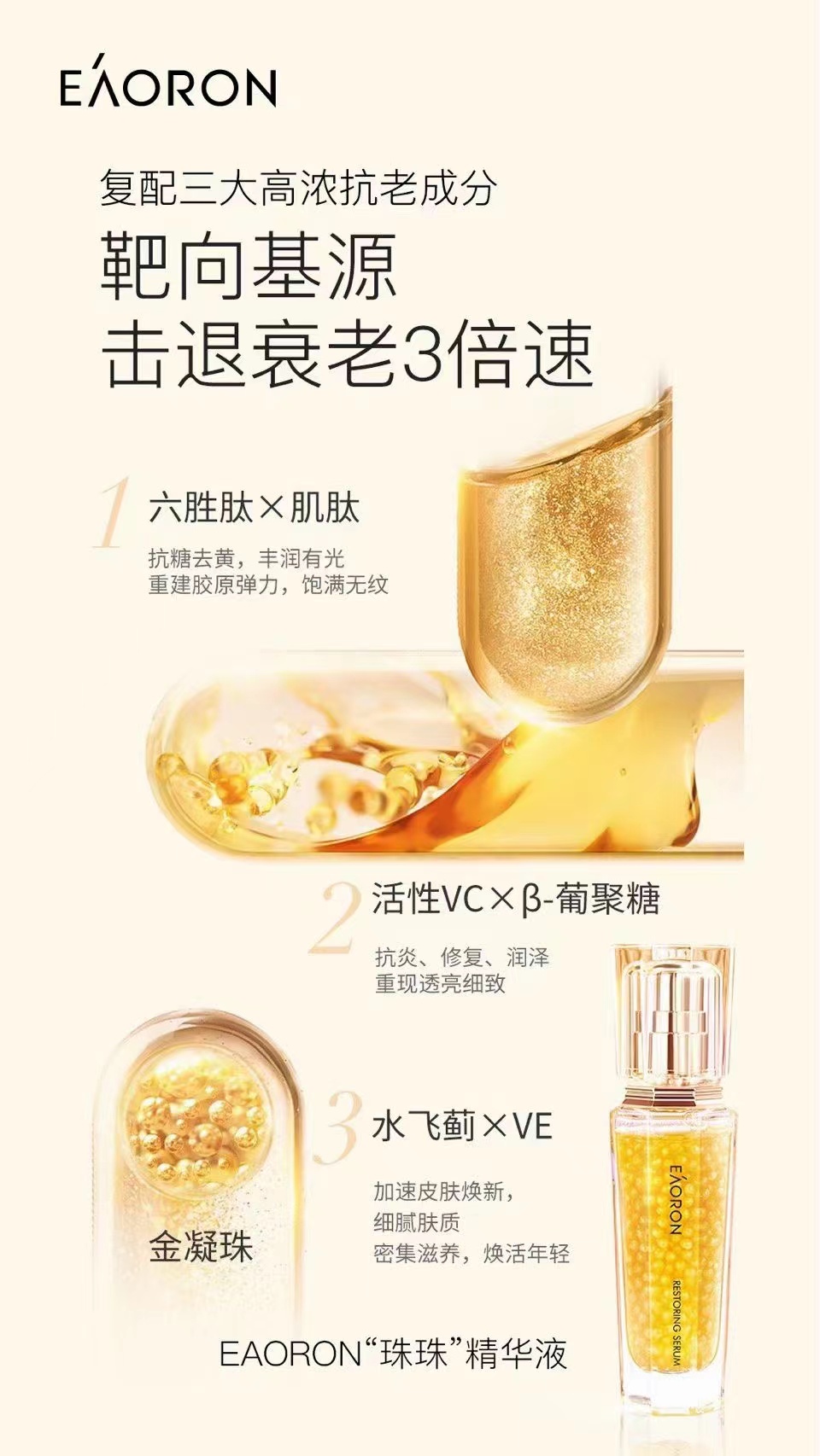 提升!紧致!饱满!想要最佳状态,颜值技能如何点满 ?EAORON至臻精华系列 RNA+珍稀酵母菌多肽,颗颗微囊包裹肌肤“锁鲜”科技,让肌肤享受“无损”的鲜活营养,双效对抗初老问题。