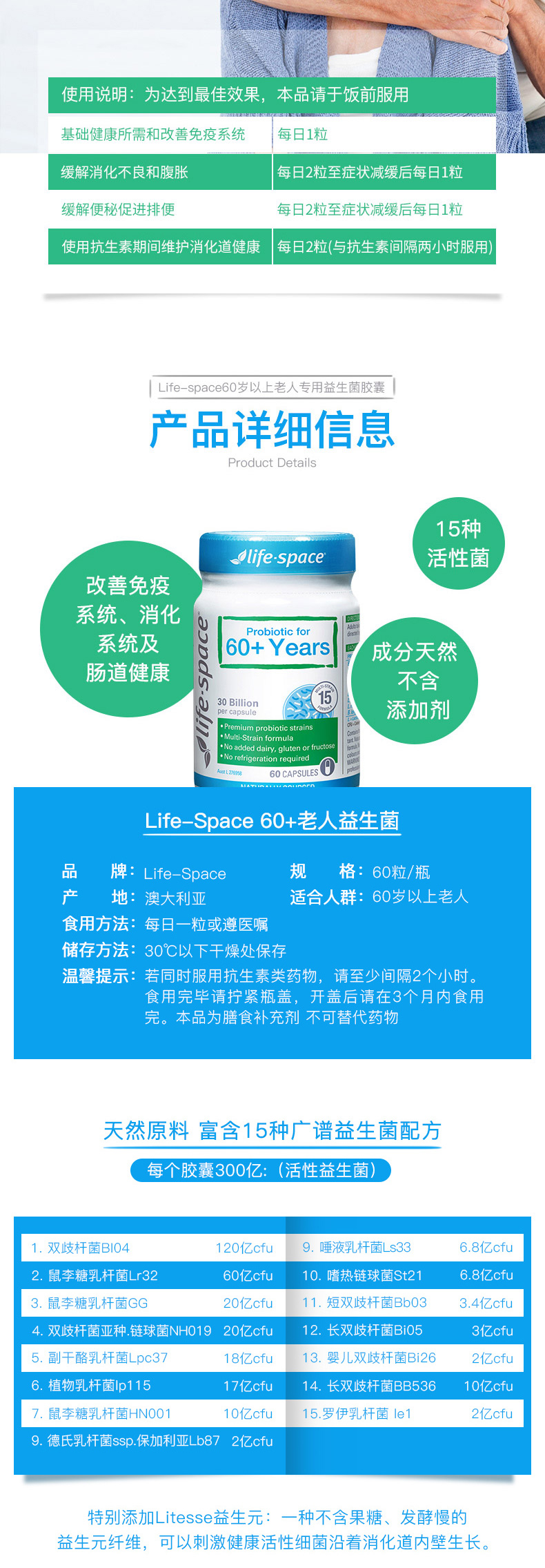 澳洲Life Space老人益生菌 60粒老年人肠胃变虚弱,吃啥啥不消化。含有15种广谱益生菌配方,改善60岁以上老人肠胃,同时还加入了其他多种益生菌,帮助身体更好的制造维生素K和D、增强肠胃对钙的吸收,有效地防止老年骨质疏松、排便不畅快。